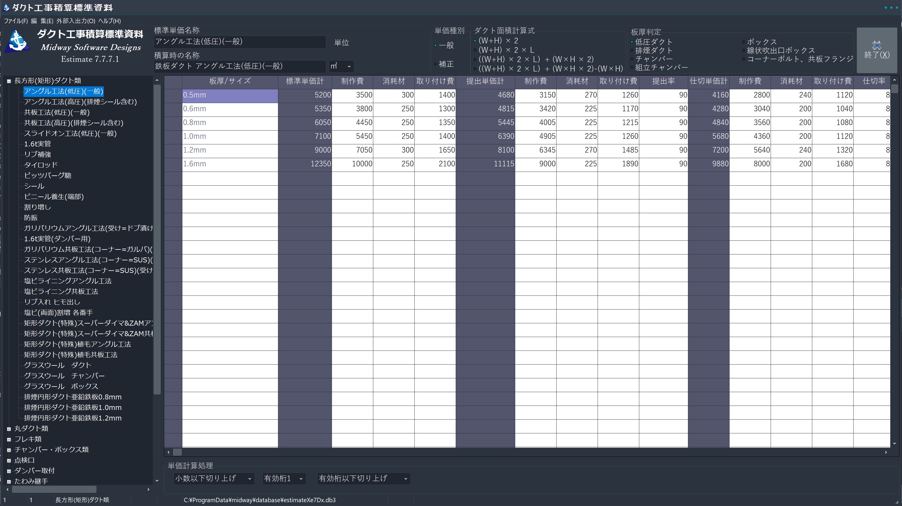 ダクト工事積算標準単価を登録・管理する専用プログラム